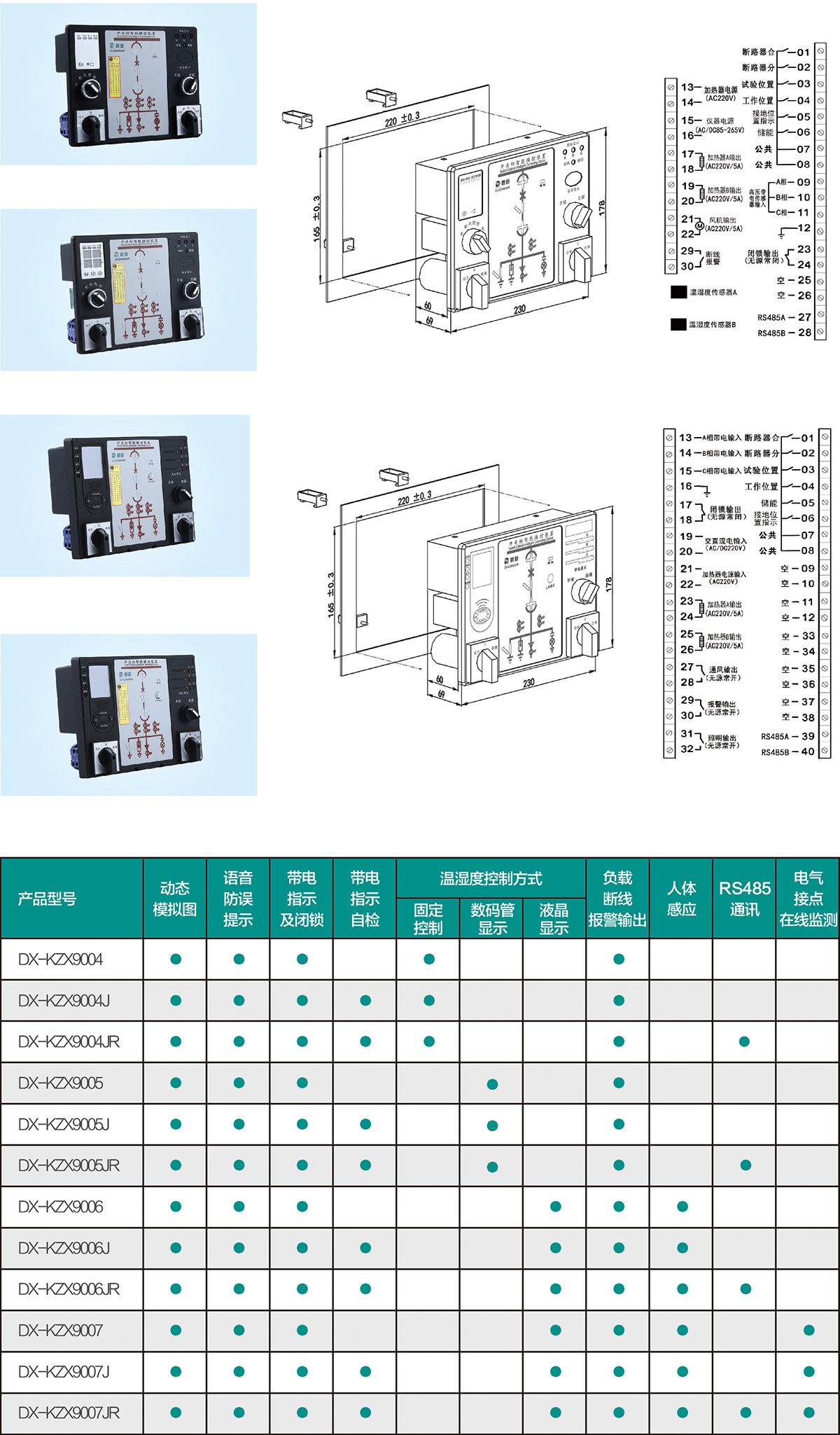 DX-KZX9000系列開關柜智能操控裝置,產(chǎn)品功能強大,具有動態(tài)一次模擬圖、高壓帶電顯示、自動加熱除濕數(shù)值顯示及控制、斷路器分合狀態(tài)指示、儲能指示、接地開關狀態(tài)指示、小車位置指示、分合閘回路完好指示、人體感應帶電提示及柜內(nèi)照明、觸頭/電纜搭接頭無線測溫功能、語音防誤提示等功能,并且具有尺S485通訊接口,能夠使開關柜進一步智能化,網(wǎng)絡化,數(shù)字化,方便廣大用戶使用與操作。